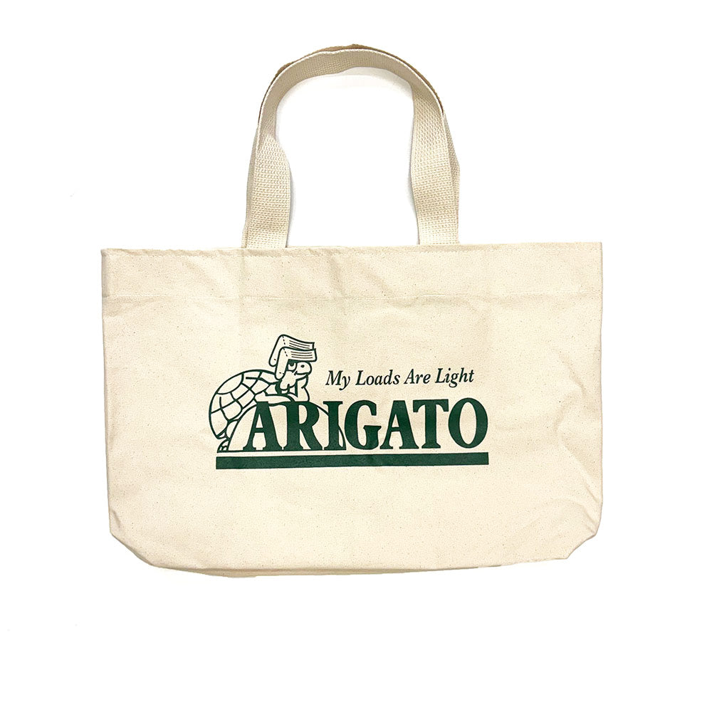 「ARIGATO」のプリントを施したキャンバストートバッグ。