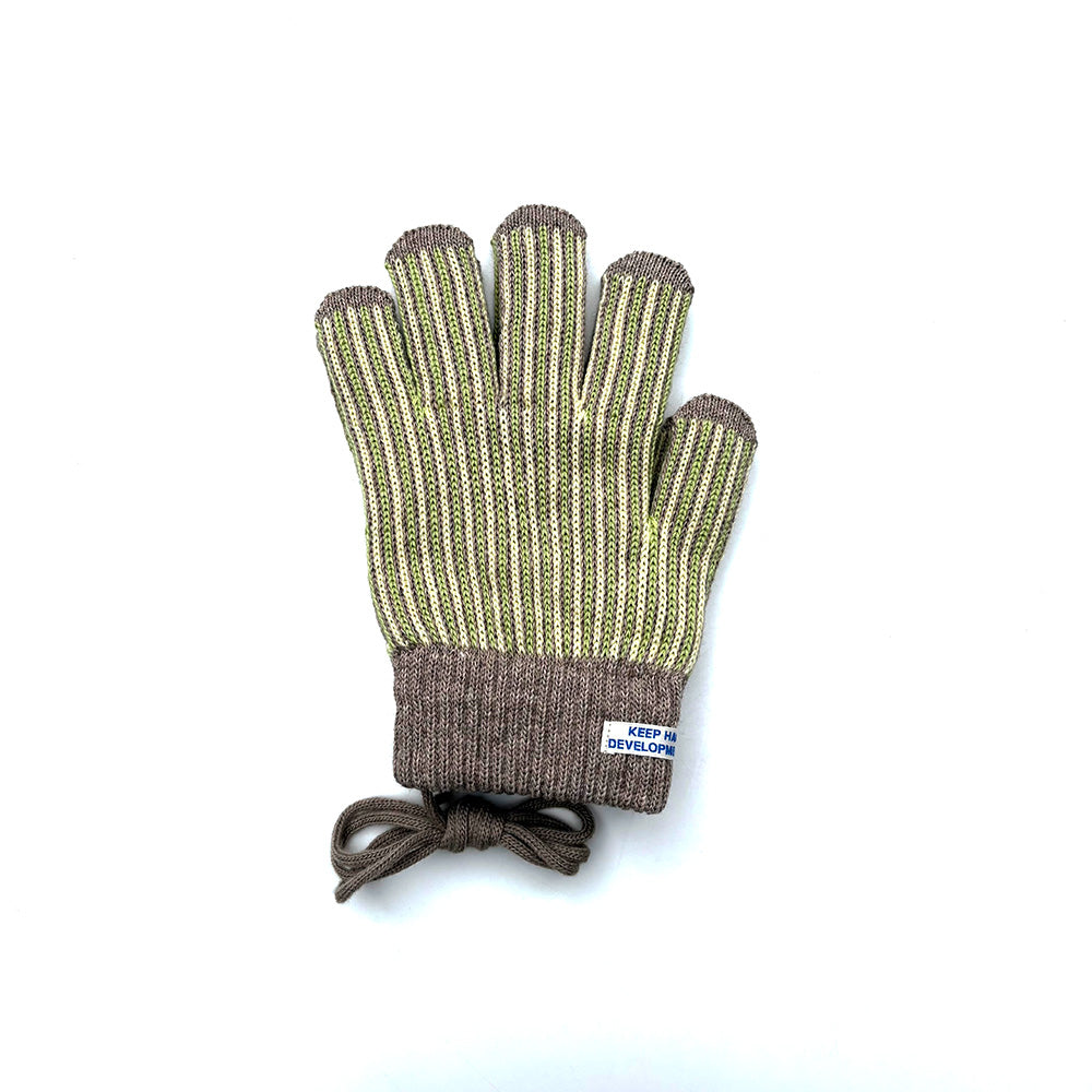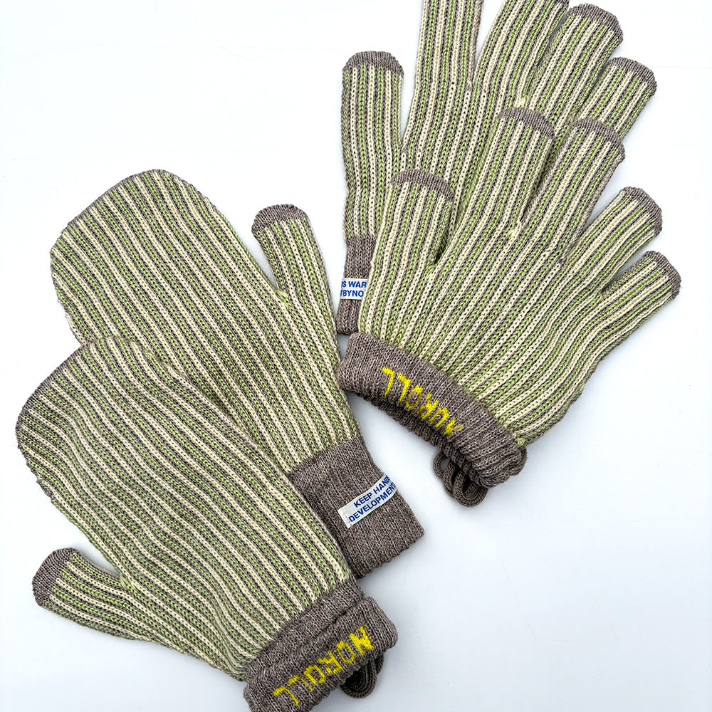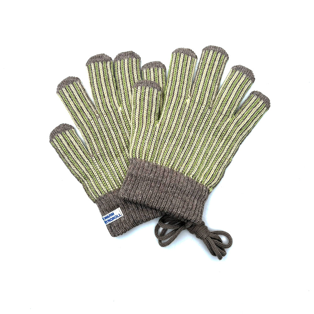 アップサイクルウールと廃棄ペットボトルを利用したリサイクルアクリルの糸を使用した手袋。