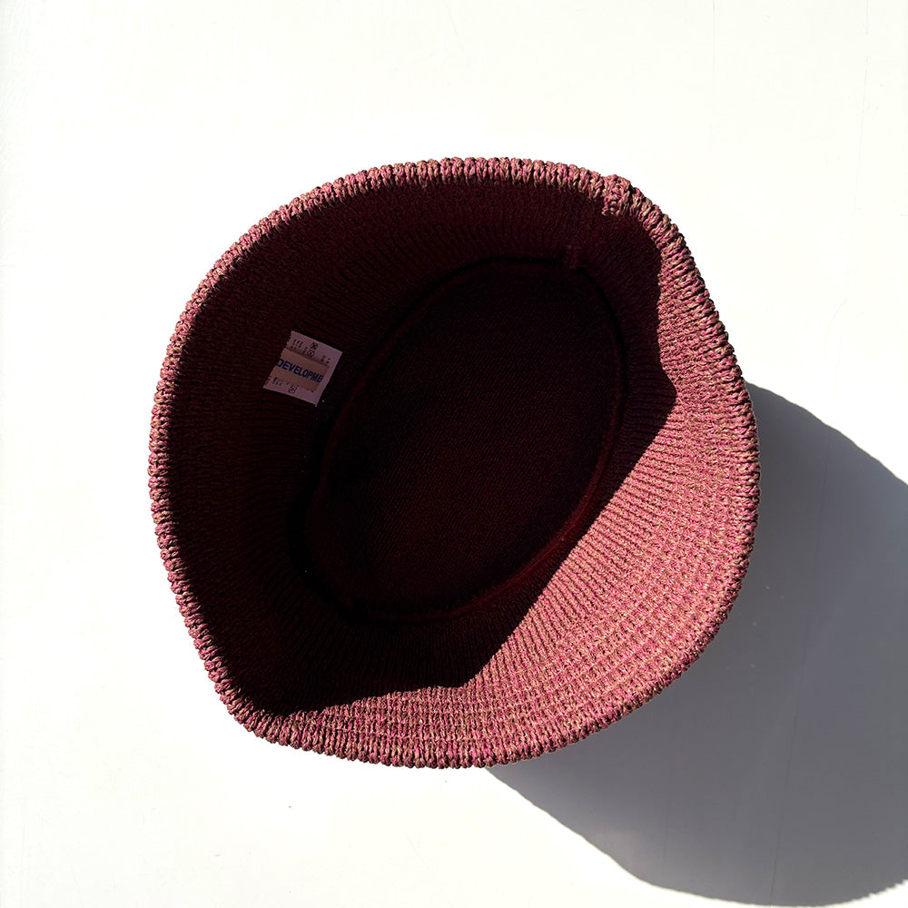 和紙、ポリエステル、ナイロンをブレンドしたシャリ感ある糸を2色混ぜ撚った定番ニットバケットハット。