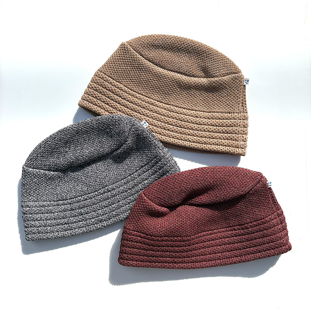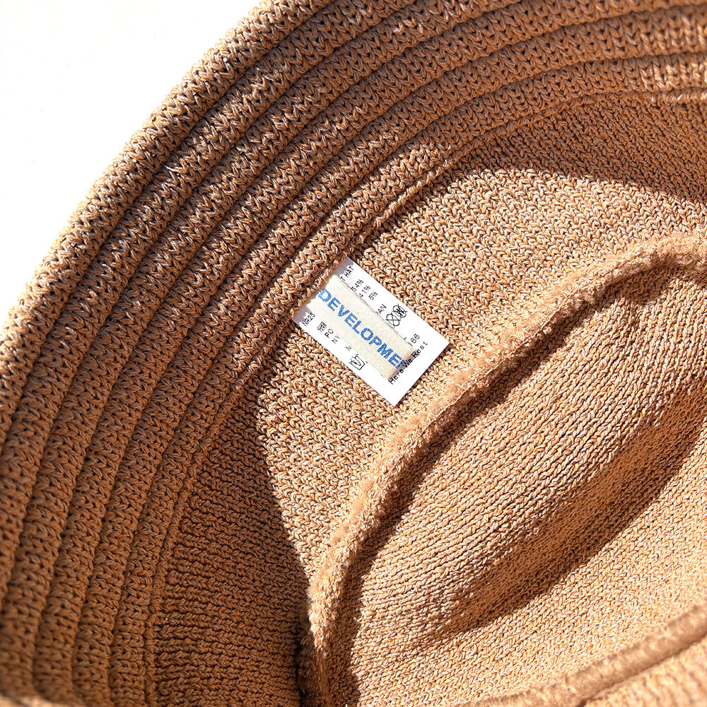 和紙、ポリエステル、ナイロンをブレンドしたシャリ感ある糸を2色混ぜ撚った定番ニットバケットハット。